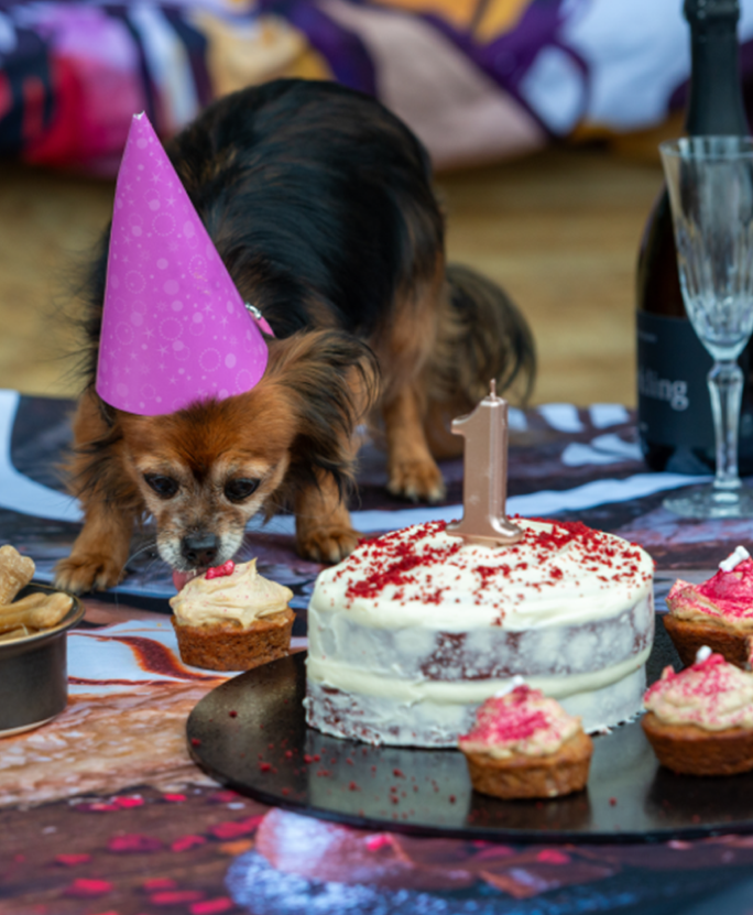 Coco is our long haired chihuahua who is 13 years young. She and Lex grew up together, so she thinks she’s a big dog and eats like one too! Coco loves licking the icing off the pup cakes.